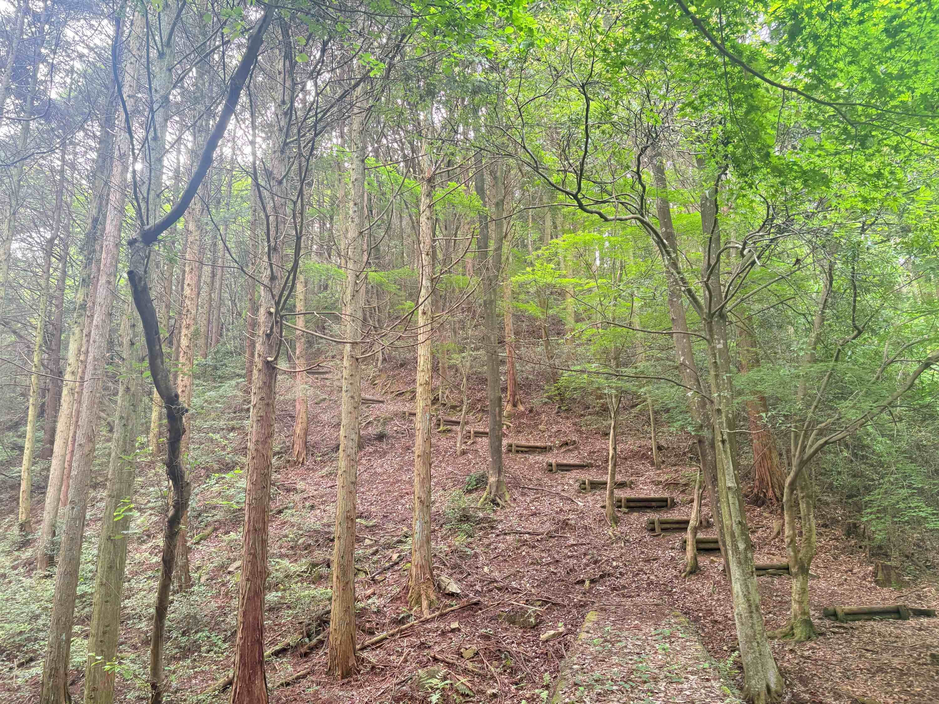 そんなEコースは舗装された道を登ると、胸高直径50㎝程度の針葉樹林に差し掛かります。