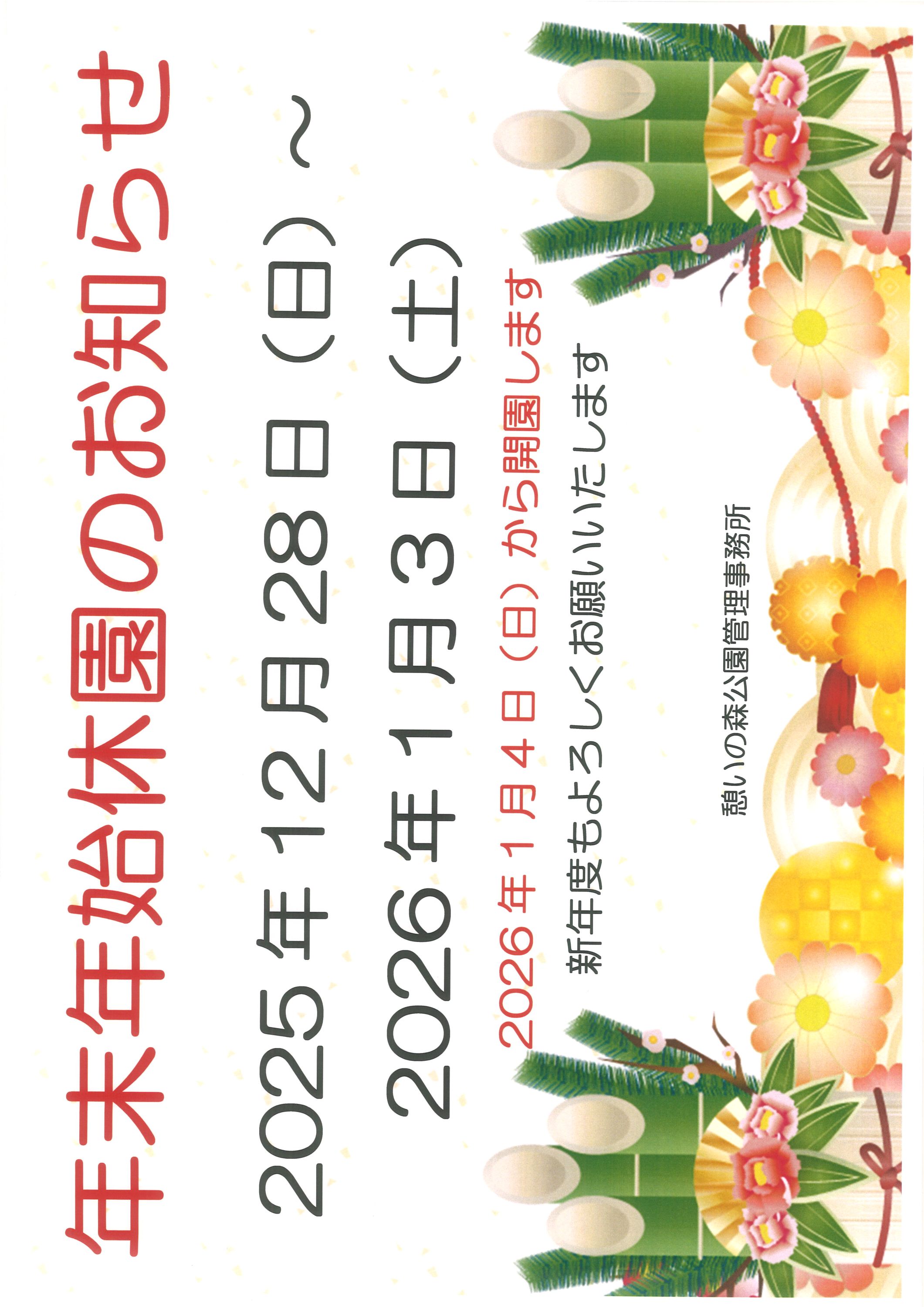 さて、憩いの森公園の年末年始の休園日につきまして、下記のとおりお知らせいたします。